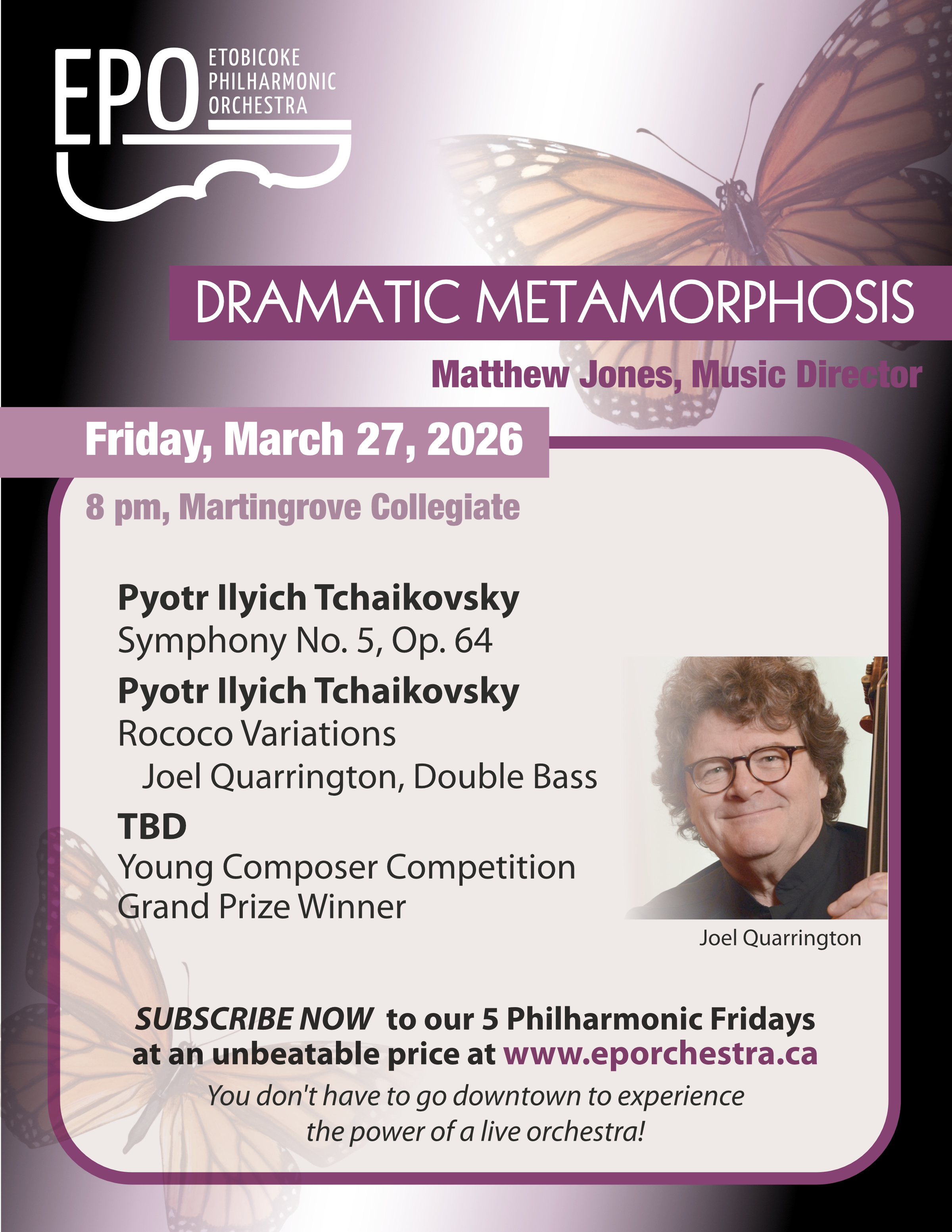 Join the Etobicoke Philharmonic on Friday, March 27, 2026 at Martingrove Collegiate Institute - 50 Winterton Drive, Etobicoke (map) - for Dramatic Metamorphosis.